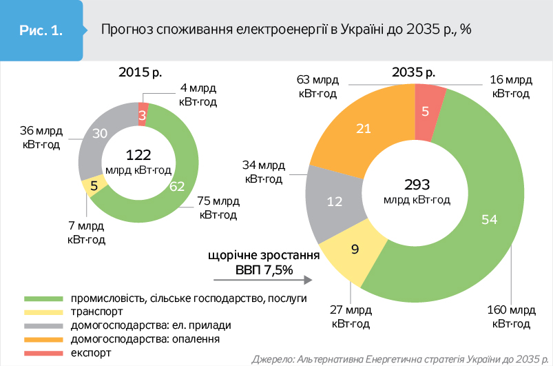 Альтернативна енергостратегія враховує, що з 122 млрд кВт∙год. (2015 р.) до 2035-го енергоспоживання збільшиться більш як удвічі - до 293 млрд (рис. 1). Простою модернізацією старих, особливо розподільних, мереж у цьому разі не обійтися. Тому документом передбачена широкомасштабна модернізація розподільних мереж з переходом на електромережі 20 кВ для забезпечення можливості переходу на електроопалення. Це скоротить втрати електроенергії в мережах удвічі - з 12 до 6%, забезпечить збільшення максимально допустимої потужності споживання, підвищення якості електроенергії до рівня стандартів ЄС і надійності її поставок.