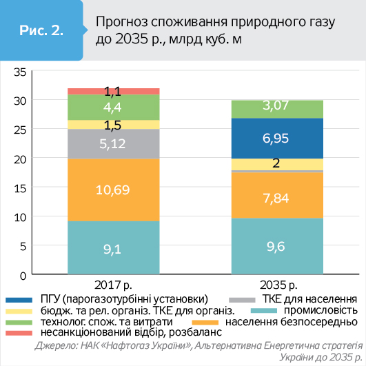 Подивімося окремо на прогноз споживання природного газу (рис. 2).Згідно з розрахунками альтернативної енергостратегії, до 2035-го споживання по країні скоротиться на 7,6 млрд кубометрів. При цьому найбільше скорочення споживання газу прогнозують саме в секторі індивідуального опалення, про що докладно сказано вище.