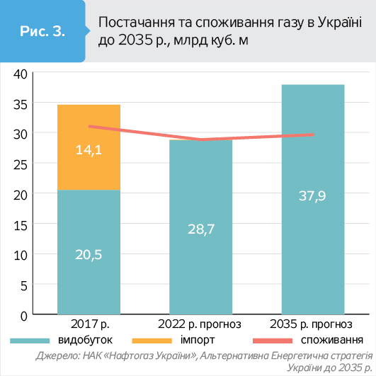І отепер - про баланс природного газу. Якщо в 2016-му (та й у 2017-му ситуація не дуже змінилася) дефіцит газу становив 11,4 млрд кубометрів при власному видобутку (усіма компаніями) 20,5 млрд, то розрахунки альтернативної енергостратегії показують, що видобуток газу становитиме 37,9 млрд кубометрів (до 2035 р.), а його профіцит - 8,1 млрд (рис. 3).