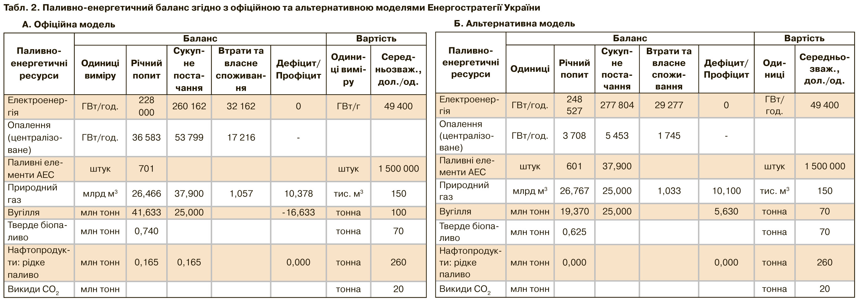 Вище йшлося про основні принципи енергетичної стратегії. Ключове питання: яким буде паливно-енергетичний баланс України у разі реалізації офіційної (частина А табл. 2) і альтернативної (частина В табл. 2) енергетичних стратегій України.