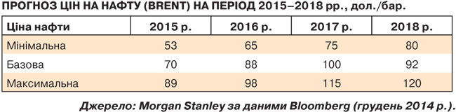 Для цього скористаємося прогнозами Світового банку, Bloomberg і Morgan Stanley. У таблиці наведено розрахований Morgan Stanley за даними Bloomberg (грудень 2014 р.) прогноз цін на нафту (Brent) на період 2015–2018 рр.