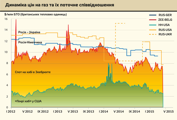 2015 р. становитиме 222 дол./тис. кубометрів, що на 35% нижче порівняно з цінами 2014-го. По-друге, якщо подивитися на ціни на європейському споті, то вони вже зараз нижчі за цю ціну, про що свідчать порівняльні дані Центру східноєвропейського газового аналізу (США).