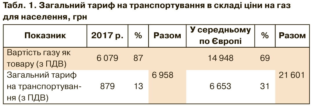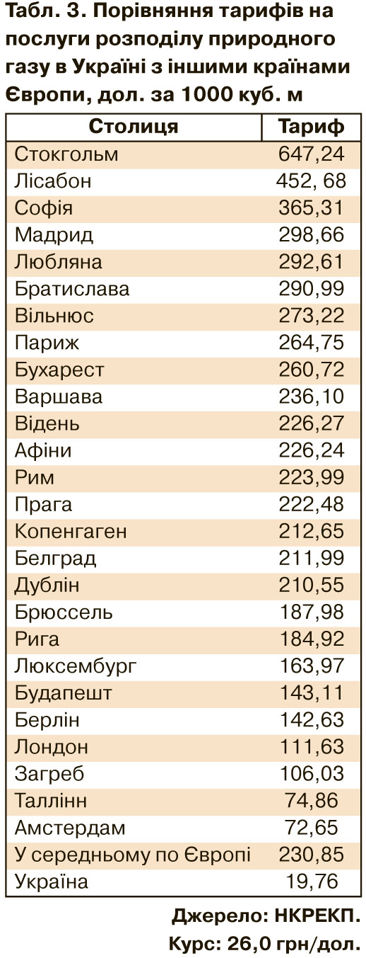 Утім, ця цифра все одно й близько не дорівнюватиме тарифам європейських операторів, попри те, що вартість самого газу для побутових споживачів у Європі та в Україні вже порівнянна. Та навіть якщо відкинути абсолютні цифри й порівнювати відсоткові величини, то легко переконатися в недостатності тарифу. За даними НКРЕКП, частка середньоєвропейського тарифу на транспортні послуги в загальному чеку за газ у європейців становить 31%, тоді як українці, оплачуючи послуги газопостачання, за доставку газу платять не більш як 13% від загальної суми платежу (табл. 2).