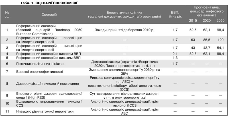 На рис. 1 наведено прогнозну динаміку імпорту природного газу країнами Євросоюзу до 2050 р. за різними сценаріями, сформульованими Європейською комісією. Ці дані свідчать, що майже за всіма основними сценаріями експерти Єврокомісії прогнозують протягом п'яти років (2015–2020 рр.) зниження обсягів імпорту природного газу. Особливо за умови вжиття додаткових заходів, зокрема заходів з енергозбереження, та за умови спрацювання окремих чинників, що безпосередньо впливають на ціну на газ, зокрема на ціну у доларах за барель у нафтовому еквіваленті. Адже майже всі довгострокові контракти, приміром, з російським "Газпромом", тією чи іншою мірою зав'язано на нафтові ціни, або ціни нафтового еквівалента. (Тезисне пояснення та обґрунтування сценаріїв Єврокомісії наведено у табл.) Це може також означати, що країни ЄС, які мають довгострокові контракти з російським "Газпромом" і норвезьким Statoil, домагатимуться перегляду певних положень цих контрактів (власне, багато хто з них узгодив з "Газпромом" зниження ціни без перегляду принципових положень довгострокових контрактів).