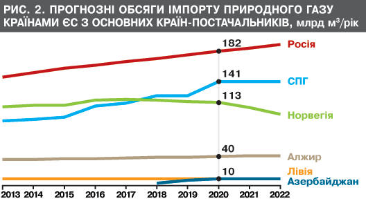 Як це може відбуватися, показано на рис. 2, де подано прогноз обсягів імпорту природного газу країнами Євросоюзу з основних країн-постачальників.