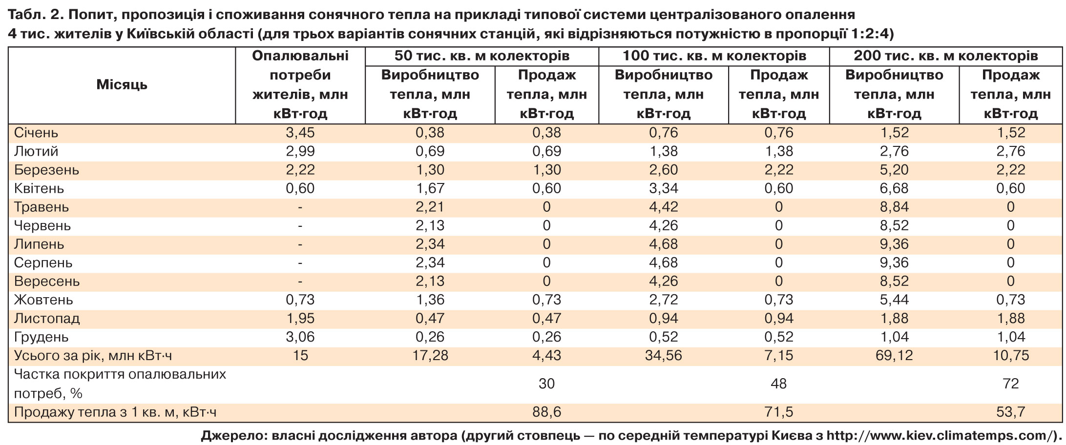 Скільки такі станції можуть замінити газу? Вони можуть замінити 30–70% виробництва газових котелень. Чому не всі 100%, видно з даних табл. 2 (на прикладі кліматичних умов Центральної України).