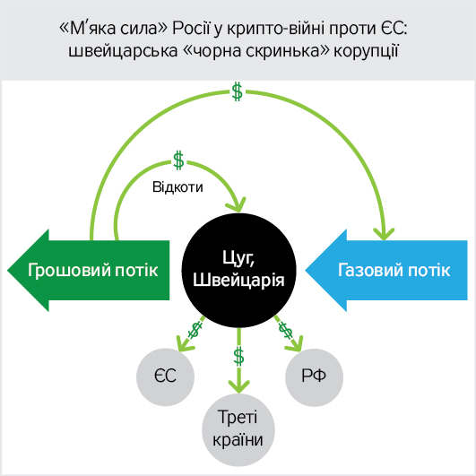 Якщо взяти до уваги, що "Газпром" є продовженням управлінської структури Кремля, то вимальовується і весь ланцюжок впливів. Тож хоча маршрут Москва-Цуг-Берлін не транспортує газу, але він забезпечує певний фінансовий потік і ретрансляцію впливів із Кремля. Фінансовий потенціал схеми непрозорого газового бізнесу та розгалужена мережа лобістсько-корупційних комунікацій дають змогу російській стороні активно впливати на гілки влади в тій чи іншій країні, маніпулюючи ними.