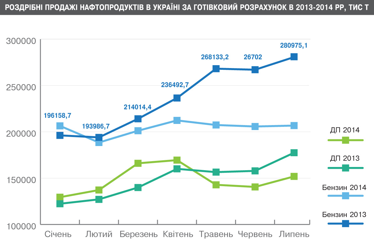 За січень-липень 2014 р. продажі нафтопродуктів на АЗС порівняно з минулим роком знизилися на 8,62% (без урахування АРК). На перший погляд, небагато, хоча, на думку галузевих аналітиків, на тлі попередніх років із їх 2–3-відсотковими коливаннями -