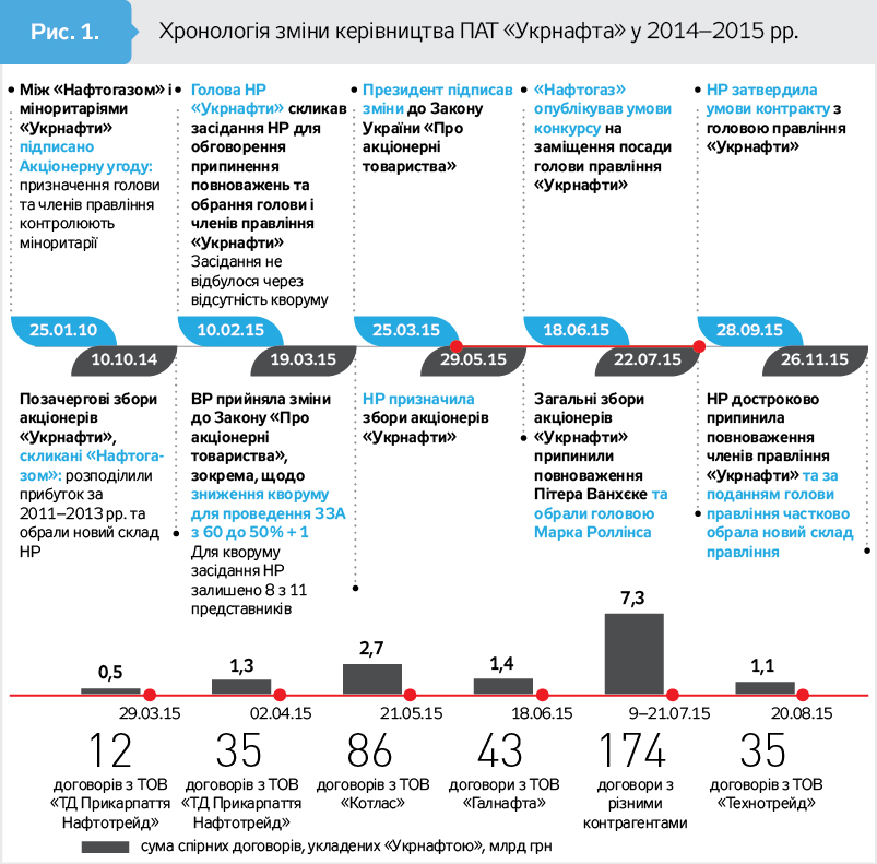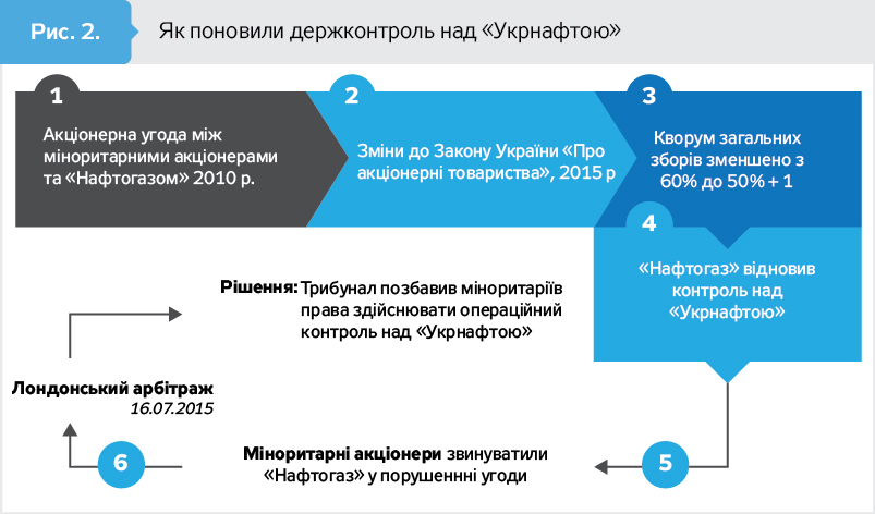 - "Нафтогаз України" використовував доступні йому законні інструменти для відновлення контролю над "Укрнафтою". Через наявність акціонерної угоди 2010 року та особливості законодавства ці інструменти мають певні обмеження. Для збору доказів, на підставі яких можна приймати рішення, які не вдасться скасувати в суді, критичною є робота правоохоронних і слідчих органів (див. хронологію відносин "Нафтогазу" з "Укрнафтою", у тому числі пов'язаних з управлінням підприємством - рис. 1).