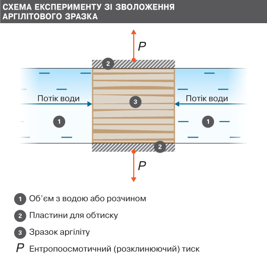 Проте усе ще діятиме інший негативний зворотний зв'язок - тепловий хаотичний рух молекул в обсязі розчину, що руйнує структуру води. Його теж можна значною мірою усунути, якщо створити просторові труднощі для руху молекул, наприклад, розбити об'єм на мікрощілини (див. рис.), тобто взяти глинистий сланець і привести його в контакт із водою. Ентропоосмотичний потік води в міжшаровий простір сланцю, підсилюваний позитивним зворотним зв'язком, може викликати збільшення тиску в зразку сланцю до десятків і сотень мегапаскалів.