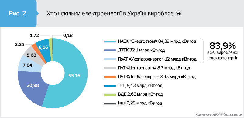 На енергоринку три основні виробники електроенергії, частка яких у загальному енергобалансі становить майже 84%, - НАЕК "Енергоатом", ДТЕК і "Укргідроенерго", - також фактично домінують у генерації (див. рис. 2).