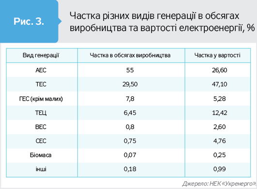 Причому частки основної генерації електроенергії значно різняться, якщо порівняти їхню вартість. Так, частка державного "Енергоатому" в загальному обсязі виробництва електроенергії становить у середньому за рік 55%, а от вартість виробленої АЕС енергії - лише 26,6%. Водночас частка ДТЕК Ріната Ахметова у загальному виробництві (саме їм належить більшість ТЕС) дорівнює 29,5%, а вартість - 47,1% (див. рис. 3).