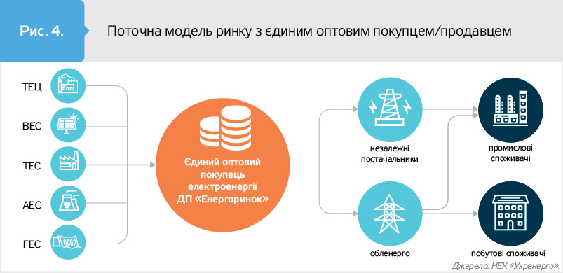 Уже понад 15 років ринок енергопостачання України працює, як свого часу ринок Великої Британії, за образом і подобою якого його створювали. Тобто як своєрідний пул або, точніше сказати, як ринок єдиного покупця і продавця. Це означає, що всі виробники електроенергії (генерація) продають усю вироблену електроенергію держпідприємству (ДП) "Енергоринок". Тарифи для кожного виробника встановлює НКРЕКП. ДП "Енергоринок" із загального обсягу продавало енергію тодішнім обленерго (тарифи для яких також установлювала НКРЕКП). Обленерго були й операторами розподільчих систем (як донедавна на ринку газу облгази), і постачальниками електроенергії безпосередньо споживачам (див. рис. 4).