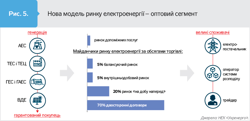 Як працюватиме нова модель ринку електроенергії в оптовому сегменті (див. рис. 5), насправді покаже практика. Причому вже незабаром. Однак ідея така: ринок двосторонніх контрактів (найбільш прогнозований і стабільний для постачальників, споживачів і операторів мережі передачі й розподілу) має становити не менш як 70%. І це буде найдешевша електроенергія. Якщо у вас стався перебір/недобір, тоді докуповуєте/продаєте на внутрішньодобовому ринку (із лагом у дві години, а це вже дорожче) або ринку "на добу наперед", а це ще дорожче. Найдорожчими будуть балансуючий ринок і ринок допоміжних послуг. Тут і зможуть заробити "Укргідроенерго" і ДТЕК, поставляючи енергію в години пік для об'єднаної енергосистеми (ОЕС), звісно, за найвищою ціною.