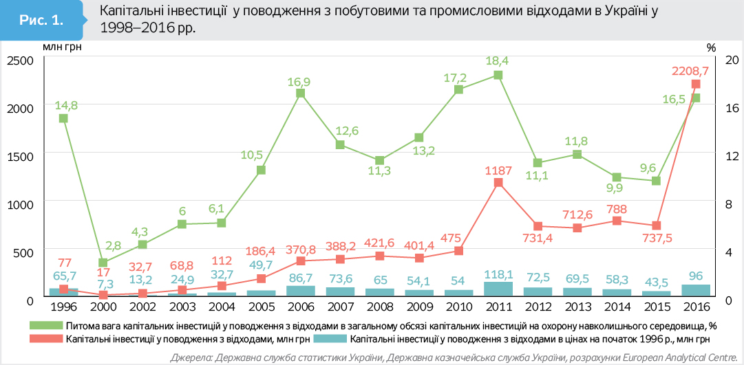Питома вага капітальних інвестицій у поводження з відходами в загальному обсязі капітальних природоохоронних інвестицій коливалася в межах 2,8–18,4%. Слід зазначити її зростання 2016-го порівняно з 2012–2015 рр., пов'язане з необхідністю збільшити критичний розмір капітальних вкладень у зв'язку з поглибленням "сміттєвої" кризи.