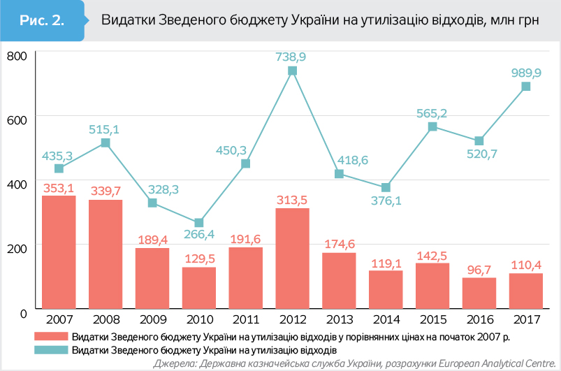 На жаль, у 2016–2017 рр. видатки зведеного бюджету на утилізацію відходів порівняно з 2012 р. скоротилися на 218,2 млн і 49 млн грн, відповідно. Максимально витрати бюджетів усіх рівнів на утилізацію відходів було скорочено в 2013–2014 рр., що пов'язано з політнестабільністю в країні та звуженням бюджетних можливостей у фінансуванні природоохоронних заходів.