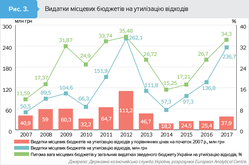 Номінальний обсяг витрат на утилізацію відходів збільшився 2017-го порівняно з 2016 р. за рахунок як державного, так і місцевих бюджетів. Для першого зростання становило 69,5 млн грн, для других - 99,9 млн. При цьому структура видатків зведеного бюджету на утилізацію відходів недосконала. Питома вага місцевих бюджетів у загальних бюджетних витратах у 2007–2017 рр. коливалася в діапазоні 11,6–35,5%. Але деякі позитивні зрушення в цьому напрямі вже відбуваються.
