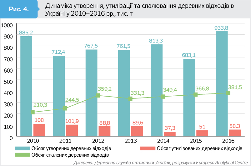 Загалом поводження з деревними відходами вирізняється невисоким рівнем ефективності як у лісовому господарстві, так і в деревообробній промисловості. Свідченням чого є висхідна тенденція за 2010–2016 рр. у динаміці спалювання деревних відходів.