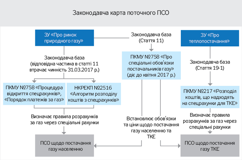 Відповідно до положення про покладення спеціальних обов'язків на суб'єктів ринку природного газу для забезпечення суспільних інтересів у процесі функціонування ринку природного газу (відносини в перехідний період), "Нафтогаз України" має поставляти газ населенню й теплопостачальним підприємствам, які уклали типовий договір, узгодили графік погашення заборгованості та розраховуються через спецрахунки. До обов'язків "Нафтогазу" належить також приймання віртуальної оплати - субсидій та оплати через спецрахунки за алгоритмом, визначеним НКРЕКП (див. рис.).