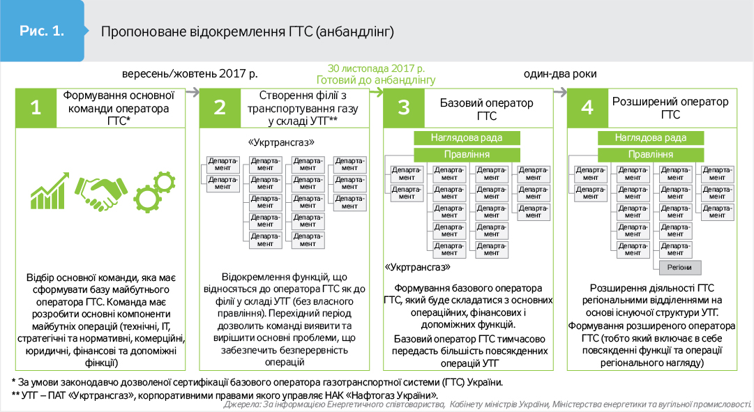 За задумом ініціаторів, процес відділення ГТС і створення нового оператора має складатися з чотирьох основних кроків. Причому перший з них - формування основної команди оператора ГТС - має завершитися у вересні-жовтні 2017 р. (див. рис. 1 на сайті DT.UA). Передбачається, що основна команда майбутнього оператора ГТС сформує підкоманди, які визначатимуть форму основних складових діяльності такого оператора. А саме: технічна команда, IТ команда, команда зі стратегії та регулювання, комерційна, юридична, фінансова й команда з підтримки. Основна