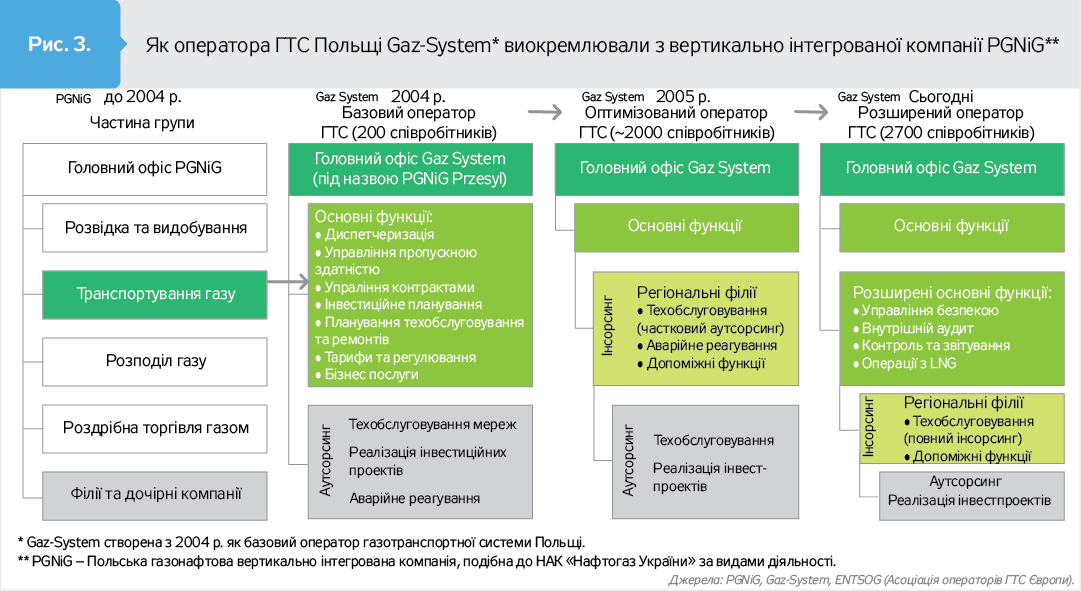 Прикладом відділення транспортування газу та формування самостійного й ефективного оператора ГТС часто називають польську Gaz-System, яка з 2004 р. почала відділятися від материнської компанії PGNiG. Сьогодні це повноцінний оператор ГТС (див. рис. 3 на сайті DT.UA). Але дорогу до цього не було вистелено пелюстками троянд. За інформацією джерел DT.UA, не обійшлося без корупційних скандалів та ін. Але загалом на сьогодні оператор польської ГТС - компанія Gаz-System цілком успішна. Хоча, як і "Нафтогаз", ризикує постраждати у разі реалізації "Північного потоку-2", як і в ситуації з OPAL, що дозволяє "Газпрому" практично монополізувати транспортування газу, всупереч усім публічним і юридичним протестам Польщі й України.