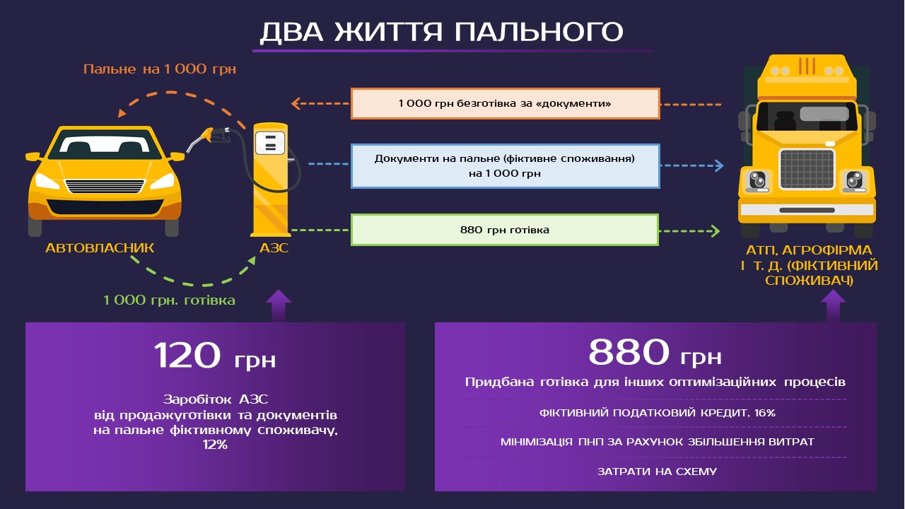 Однак заради чого все це? Тарифи такі: якщо заправка просто продає документи на паливо конвертаційному центру, вона заробляє 7% від вартості партії. А якщо в складі бізнесу нафтотрейдера є ще й бізнес із продажу вирученої на АЗС готівки (спойлер: у будь-якій великій мережі, що промишляє торгівлею документами, він є), то можна додати ще 5%. Разом рентабельність схеми — 12%. Продаєш бензин або дизпаливо по 25 грн за літр за собівартістю та заробляєш 3 грн/л — більше, ніж преміум-заправки! А якщо бензин «лівий», то додай у ларчик ще 7 грн/л акцизу.
