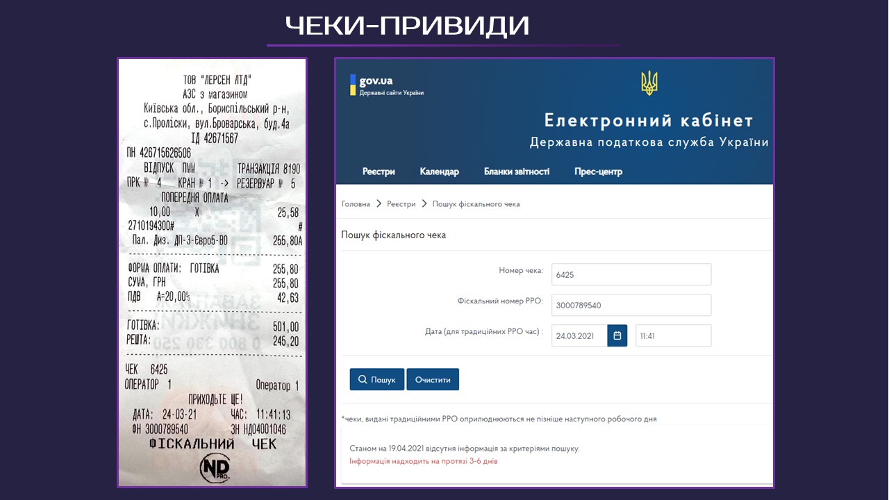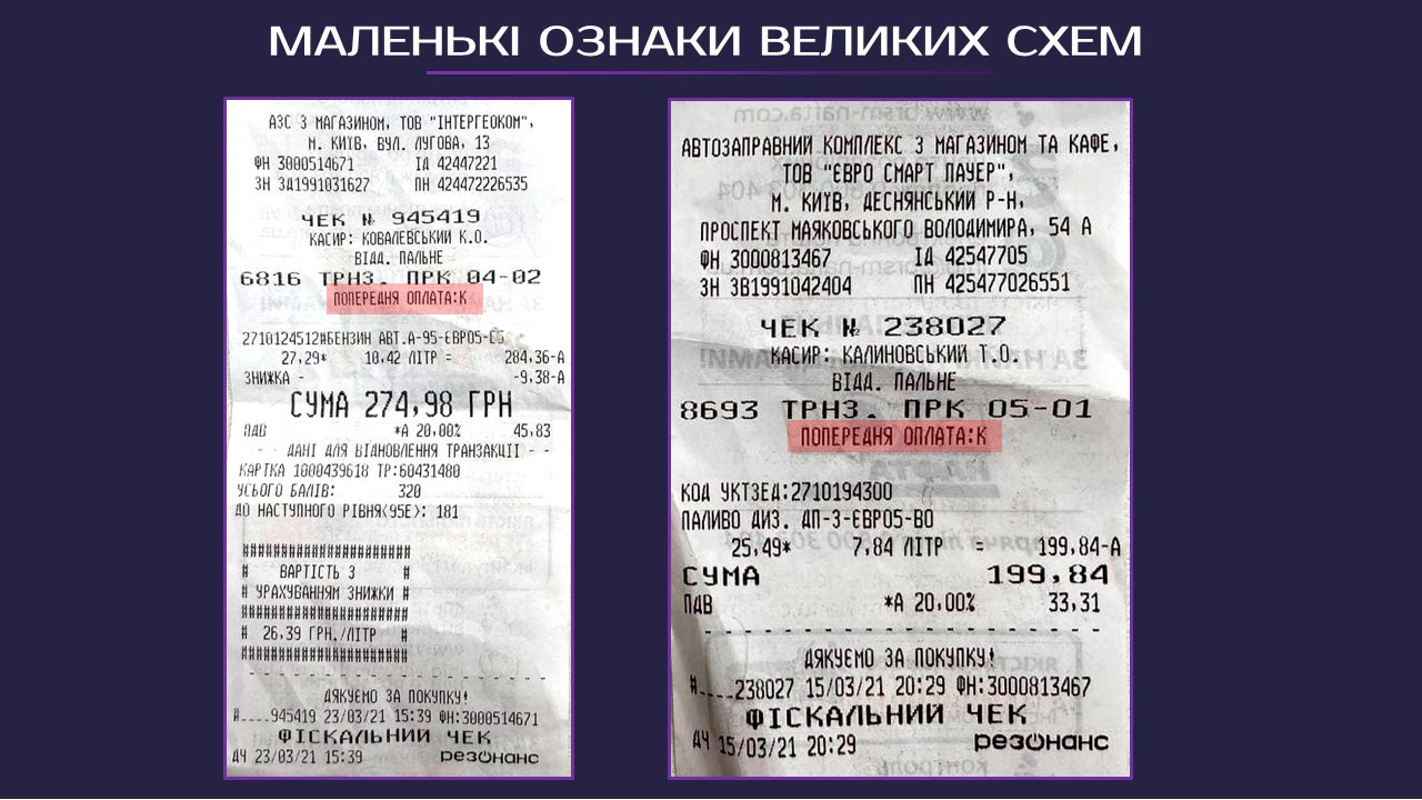 Паливо живе двома життями: у віртуальному житті на папері воно фіктивно споживається компаніями, суттєво знижуючи їм податкове навантаження, а в реальному — неврахованим продається на АЗС за готівку приватному автомобілісту. Цей продаж оформлять як відпускання раніше проданої оптової партії якомусь промисловому споживачеві. Як про це довідатися? Чимало станцій БРСМ при оплаті готівкою видасть вам чек із позначкою «К» або «Відомість К» у графі «Спосіб оплати», тоді як у чеках будь-яких із названих вище мереж буде чітко зазначено, що оплату було проведено готівкою. Тобто ви заплатили готівку, а вам дають документ про продаж за якоюсь відомістю та взагалі за якоюсь «К».