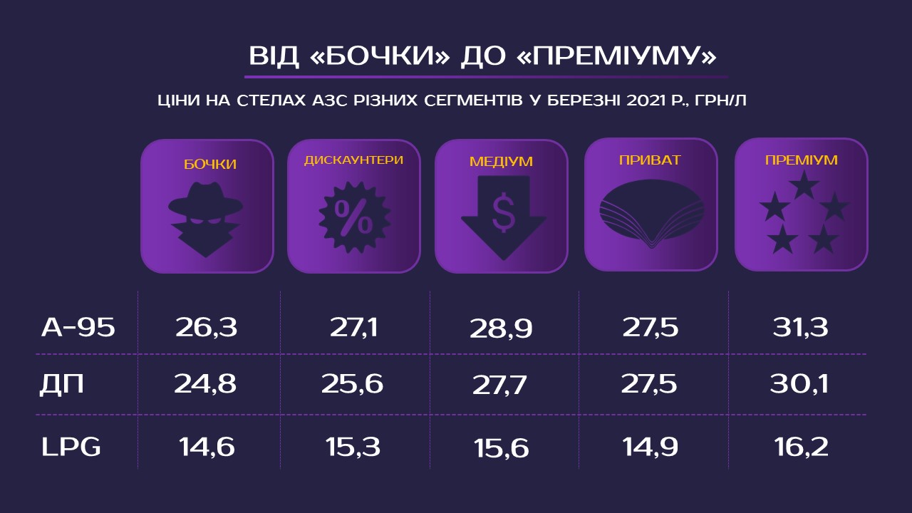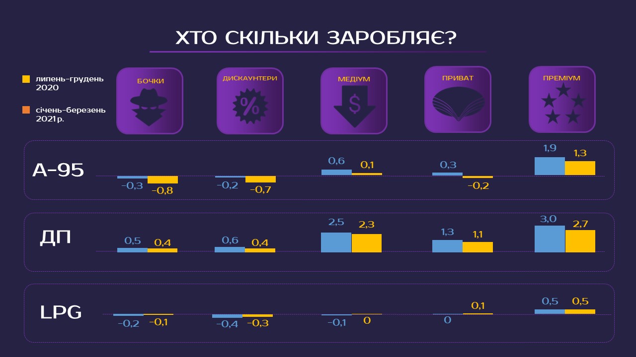 Ми відмінусували від заявлених цін на заправках купівельну вартість, витрати, податки, типові дисконти та отримали таку картину маслом. «Преміальні» заправки заробляли на бензині та дизпаливі від 1,3 до 3 грн/л, скраплений газ приносив 0,5 грн/л. У свою чергу «дискаунтери» всі дев'ять місяців торгували бензином і скрапленим газом у «мінус», аж до 80 коп./л, заробляючи в середньому 0,5 грн/л лише на дизпаливі.