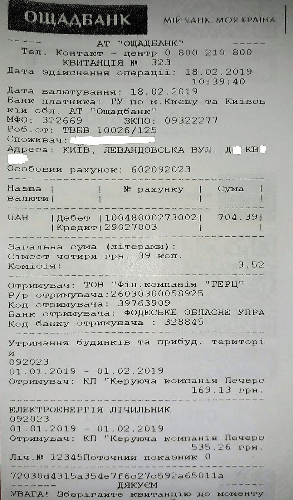 Підходить моя черга, оплачую, отримую роздруківки. І вуаля! - таки "ГЕРЦ"! Мало того, з розрахунковим рахунком в одеському, а не в київському банку (див. фото). Через півдня оплачую ще одну платіжку, район уже інший - Печерський. Результат той самий.