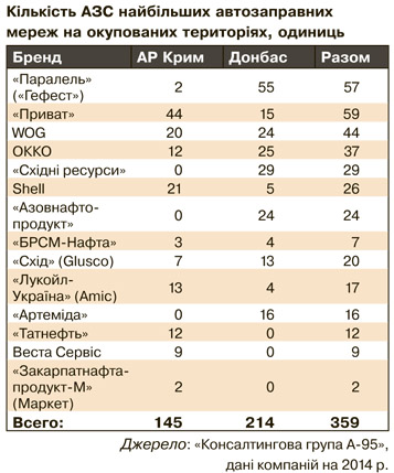 Справді, доля кримських АЗС склалася інакше. Силового захоплення тут не було, заправки залишилися у власності українських хазяїв. Виняток - мережа групи "Приват" (44 АЗС), яку було "націоналізовано" кримською "владою" і включено до складу "державного" "Чорноморнафтогазу". Вона отримала бренд "ГОСТ".