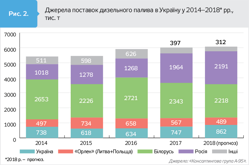 При першому ж ознайомленні з текстом заяви "Укртатнафти" стає зрозуміло: шансів на успіх у заводу немає. Невідповідності й маніпуляції помітні неозброєним оком. Наприклад, заявник не розглядає результатів 2017 р. Чому? Тому що вони псують усю картину. Якщо додати свіжі дані, то вийде, що частка українського палива на ринку три роки поспіль зростає, а частка імпорту, відповідно, падає (див. рис. 1 і 2). І якщо стосовно дизпалива зростання незначне, то ринкова частка бензину з 2015-го збільшилася з 30 до 40%, а ще у 2014 р. становила 20%. Очікується, що цього року вона буде не меншою за 50% - планка, про яку мріє "Укртатнафта" у своїй заяві, буде досягнута сама по собі.