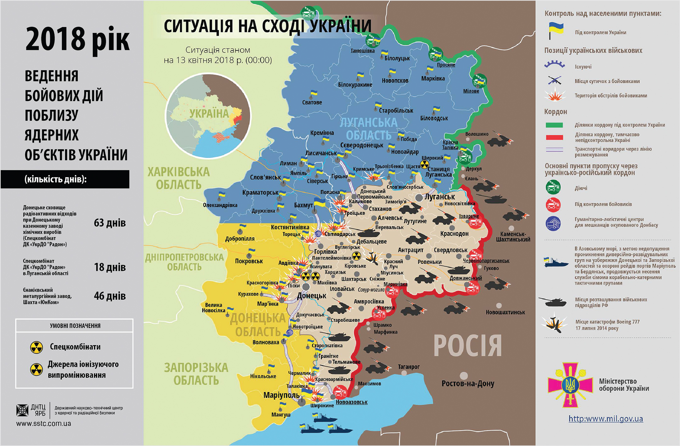 Внаслідок військової агресії з боку Російської Федерації та ведення бойових дій на Сході України, в умовах відсутності державного регулюючого контролю ядерної та радіаційної безпеки, на території ОРДЛО опинилися 73 суб'єкти господарювання, які використовували 1192 одиниці закритих радіонуклідних ДІВ. А саме станом на вересень 2014 р.: на окупованій частині Донецької області знаходилося 914 радіонуклідних ДІВ, на території непідконтрольних районів Луганської області знаходилося 278 радіонуклідних ДІВ..." - зазначає Держатомрегулювання.