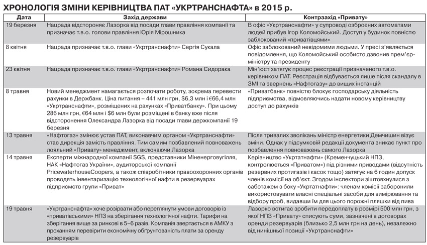 Про складності майбутньої битви за "Укрнафту" можна впевнено казати, спостерігаючи процес повернення "Укртранснафти" у державне лоно. (Щоб не стомлювати читача викладенням усіх цих баталій, хронологію заходів влади та протидії "Привату" ми оформили в таблицю). Нагадаю лише, що 19 березня спроба Міненерговугільпрому та "Нафтогазу" завезти в офіс компанії тимчасово призначеного нового главу Юрія Мірошника закінчилася приїздом Коломойського з автоматниками, барикадуванням (заодно й "Укрнафти") і наступною відставкою дніпропетровського губернатора.