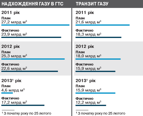 Технічна унікальність нашої ГТС полягає хоча б у тому, що вона виконує одночасно функції внутрішнього забезпечення і транзиту російського газу в Європу, які розділити неможливо (див. табл.).