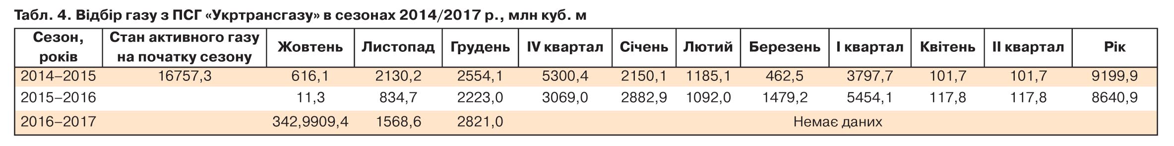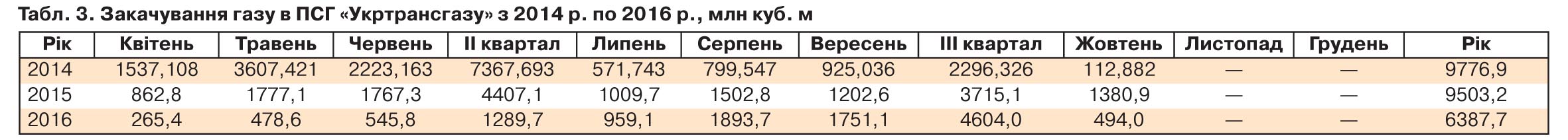 До початку опалювального сезону 2016–2017 рр. у підземних сховищах "Укртрансгазу" було сформовано запас газу в обсязі 14,7 млрд кубометрів. 16 жовтня 2016 р. розпочато сезон відбору газу з ПСГ. До цього часу в сезон 2016-го у сховища було закачано 6,3 млрд кубометрів природного газу.
