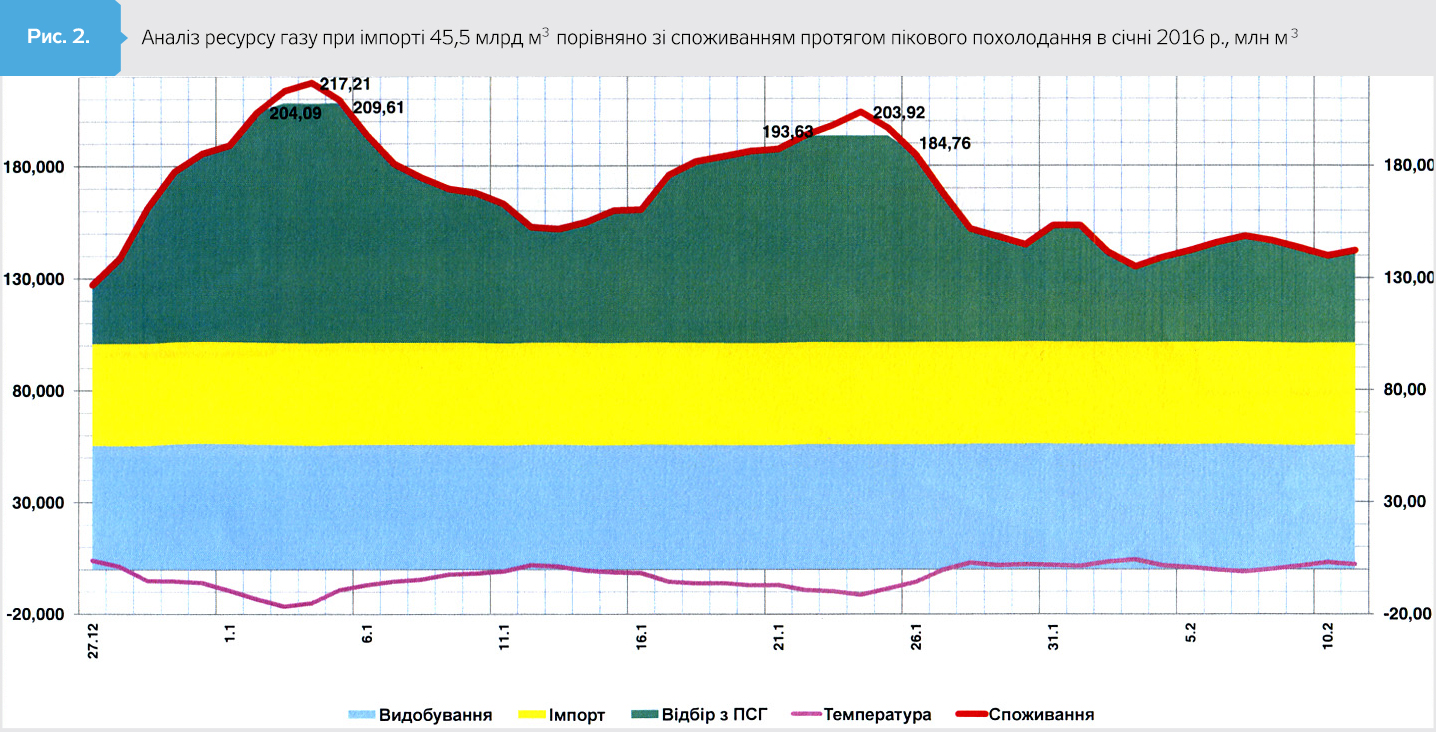 Втім, газотранспортники й НАКівці прораховували не один варіант. Наприклад, цілком комфортний - при імпорті 45,5 млн кубометрів/добу. Проаналізувавши динаміку споживання в піковий період січня 2016-го, склали прогнозний баланс газу по Україні на період з жовтня 2016 р. по квітень 2017 р. Варто зазначити, що тільки з 5 січня нинішнього року фактичне споживання газу по країні дещо перевищило 48 млн кубометрів/добу. При цьому довелося піднімати з ПСГ близько 70 млн кубометрів/добу, як це було, наприклад, 11 січня. У сховищах при цьому залишилося 11,303 млрд кубометрів. Видобуток та імпорт газу стабільні, попри похолодання і збільшення у зв'язку з цим попиту на газ.