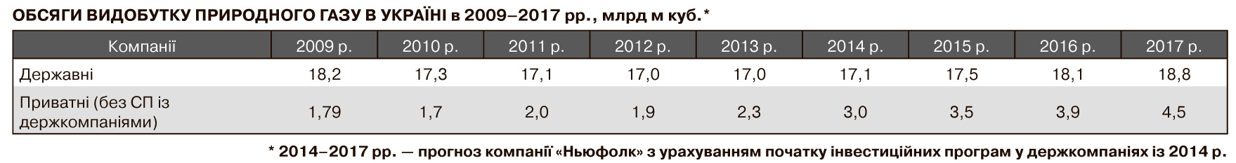 Чи слід дивуватися, що газовидобуток, точніше, найбільші добувачі природного газу - державні та напівдержавні компанії "Укргазвидобування" (УГВ) і "Укрнафта", відповідно, опинилися в загоні? Звичайно, позначається й "ефективне" управління, віддане на відкуп олігархам. "Укрнафта" за останні п'ять років знизила видобуток газу вдвічі - до 2 млрд кубометрів (2013 р.), а "Укргазвидобування" - виробник 75% газу в країні - ще наприкінці минулого року почало сповзати вниз, прискорюючись на цьому шляху цього року. За п'ять місяців 2014 р. УГВ втратило у видобутку 1,5% порівняно з минулим роком, "Укрнафта" - 8%. За оцінками аналітиків компанії "Ньюфолк", у 2014 р. держкомпанії можуть недорахуватися 0,5 млрд кубометрів газу. Далі буде гірше.