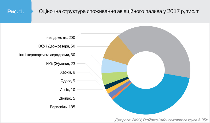 Зліт імпорту авіапалива відбувся у 2017 р. Тоді на ринок надійшло 520 тис. т палива імпортного та внутрішнього виробництва, або на 70% більше, ніж роком раніше. Українські аеропорти були не в змозі освоїти такі обсяги навіть теоретично, особливо з огляду на те, що гас у нас дорожчий, ніж у Європі, на 60–70 дол./т. Говорили про це й цифри: у шести найбільших аеропортах країни, на які припадає близько 95% усього пасажиро- і вантажопотоку, було реалізовано 241 тис. т палива. Якщо додати сюди закупівлі для військових, Держрезерву та поставки в дрібні аеропорти, то реальне споживання авіагасу 2017-го не перевищило 320–350 тис. т (див. рис. 1).