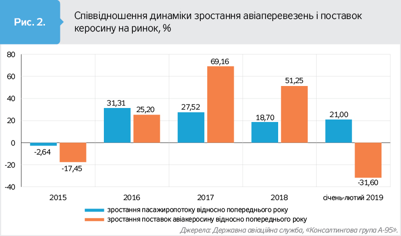 "Свято" тривало і 2018-го: обсяг палива на ринку збільшився ще на 50% на тлі зростання авіаперевезень на 21% (див. рис. 2).