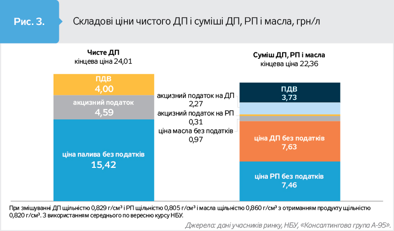 "Ціни вже не ті, та й якість перестала бути стабільною. Змінився колір ресурсу, він став жовтішим, і запах не дизельний. І колишніх обсягів більше немає", - стверджує ще один трейдер зі східних регіонів, зазначаючи, що сумішеве паливо, як і раніше, займає левову частку ринку в Миколаївській, Херсонській та Одеській областях.