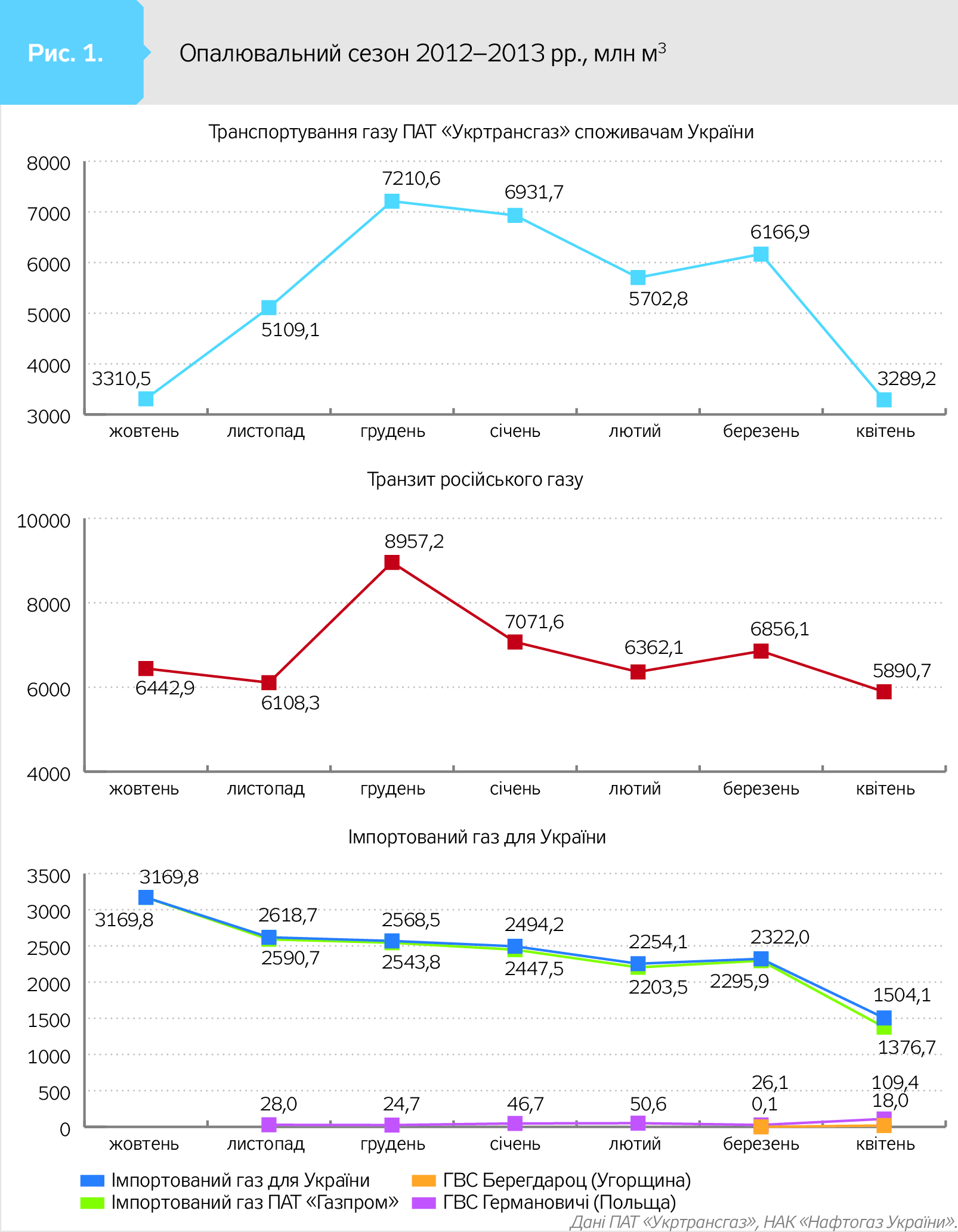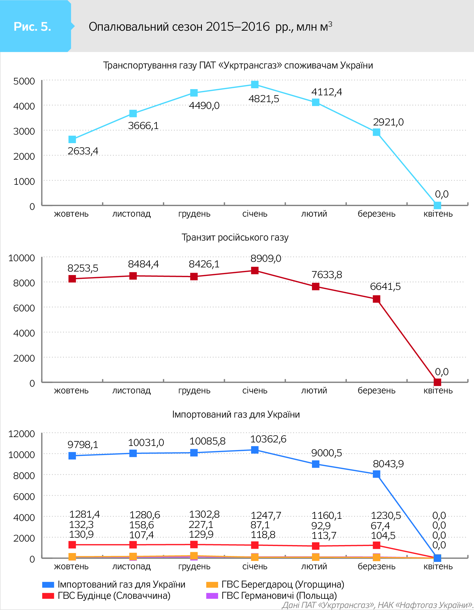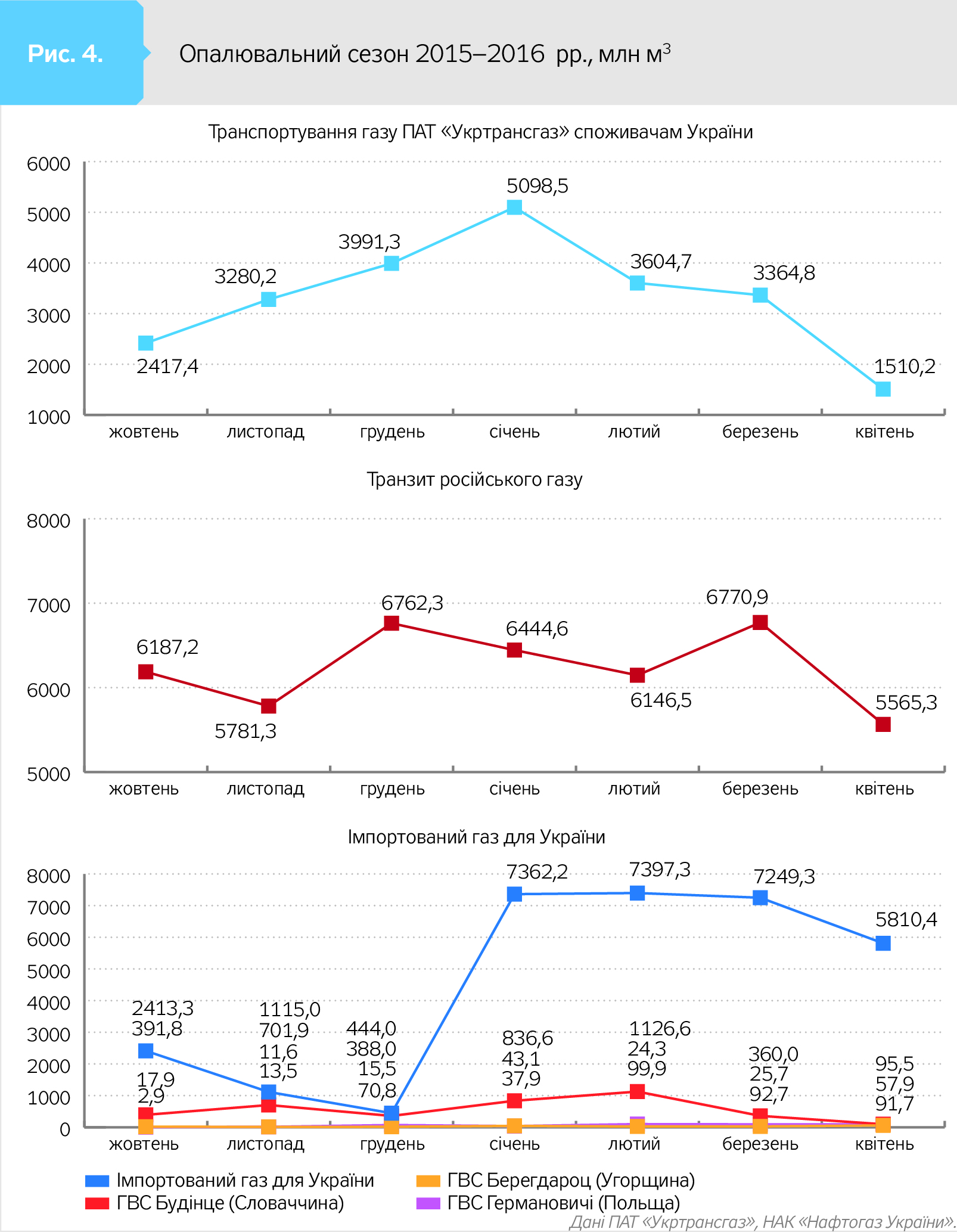 Дані таблиць і графіки імпортування газу для України на рис. 1–5 (див. на сайті DT.UA) ілюструють динаміку і тенденції кожного опалювального сезону. Зокрема, на рис. 3–5 видно, коли саме "Нафтогаз" востаннє імпортував газ у "Газпрому" - за так званим зимовим пакетом в опалювальний сезон 2014–2015 рр. І що в наступні сезони безпосередньо "газпромівський" газ "Укртрансгаз" лише транспортував (на рис. - червоний графік транзиту російського газу). Причому транспортував безперервно, виконуючи зобов'язання та заявки "Газпрому". Попри закиди останнього про ризики недопоставок у Європу через українську ГТС, чим росіяни продовжують залякувати європейських покупців свого газу, який ті отримують через Україну.