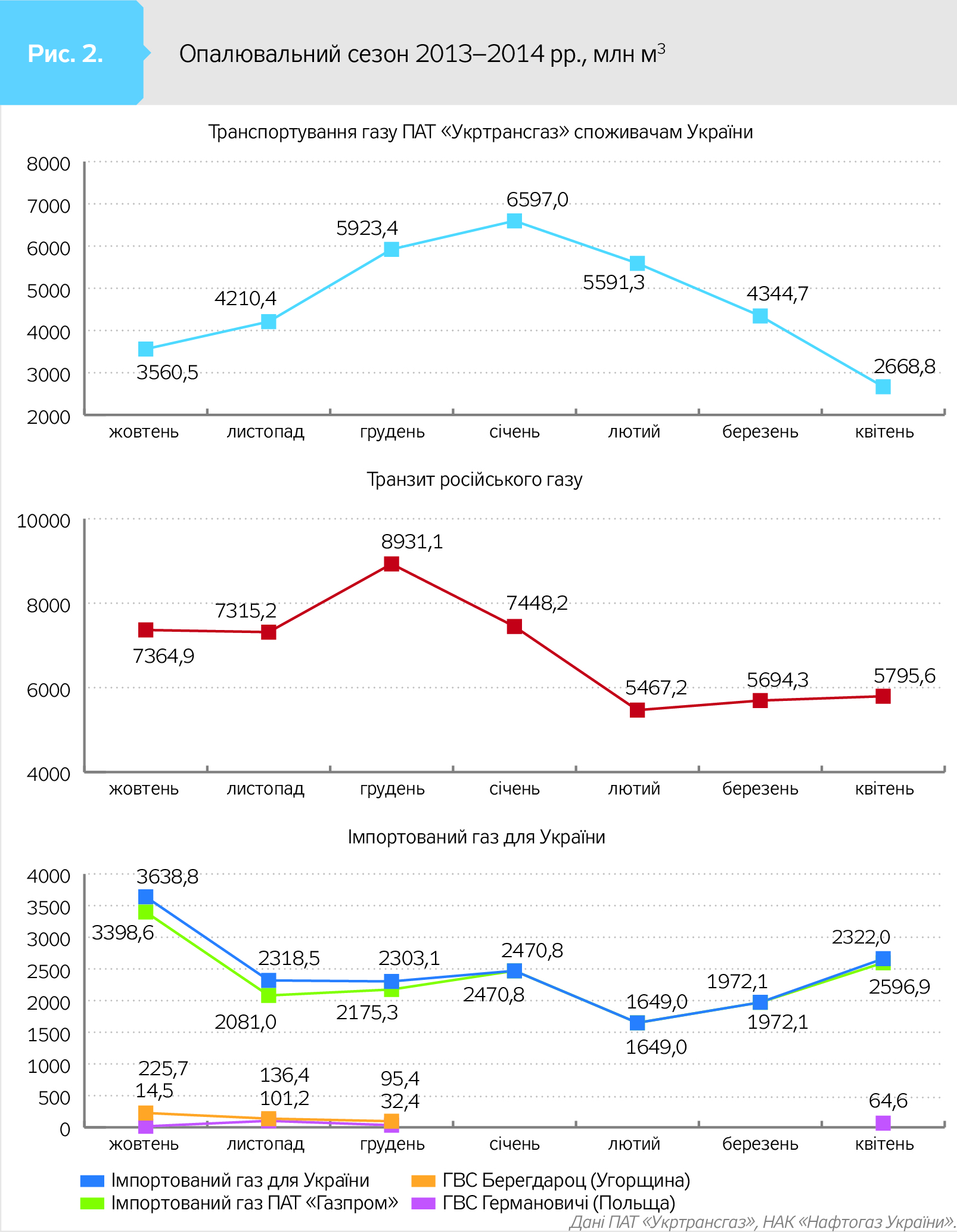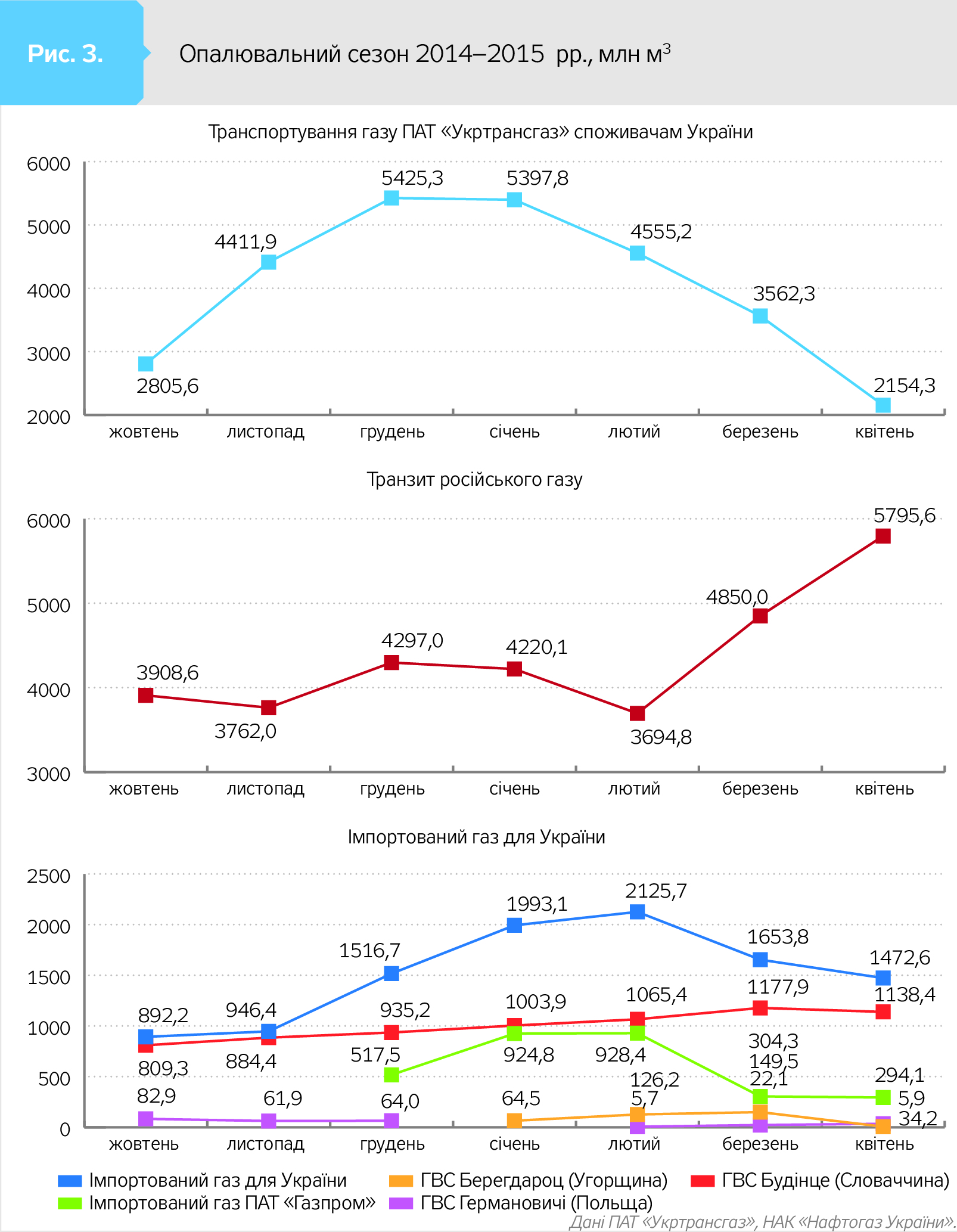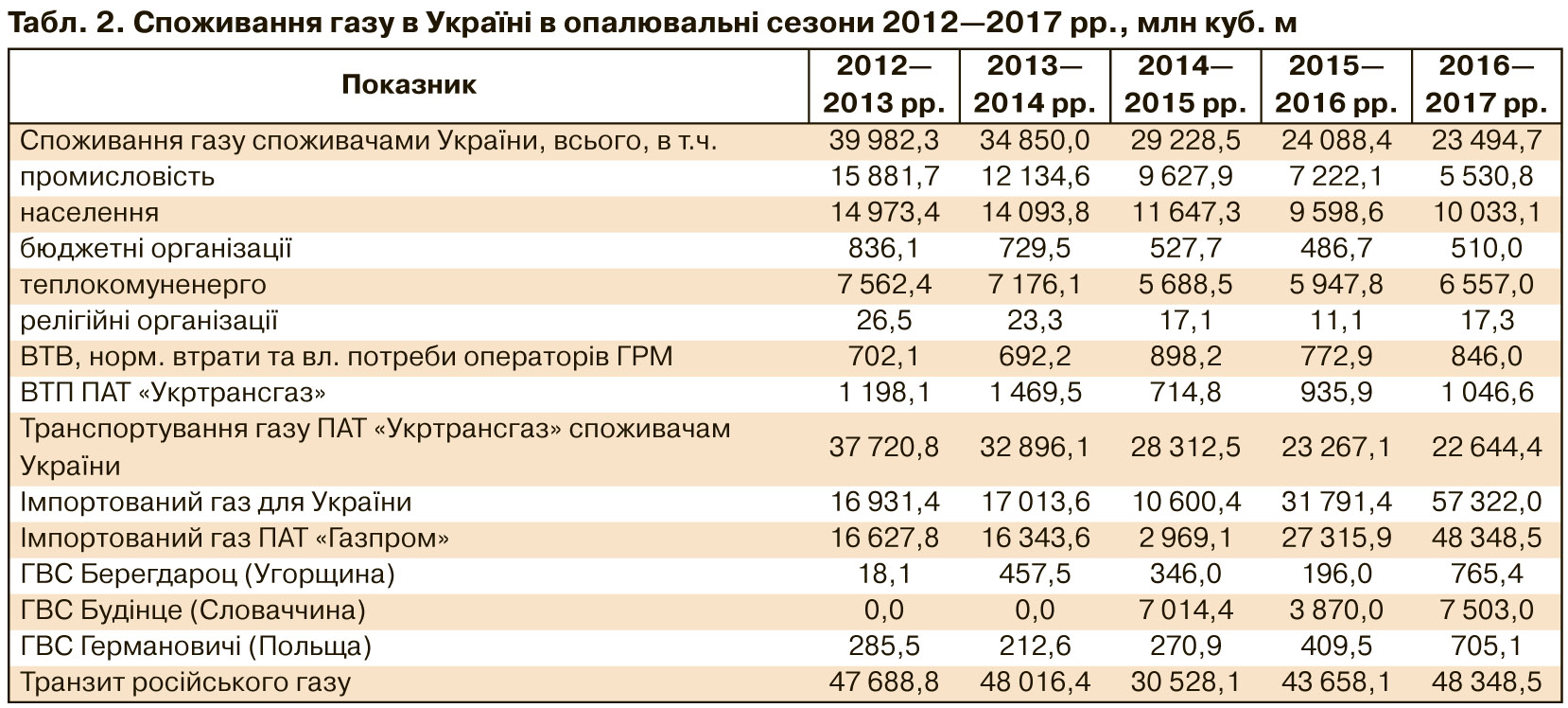З даних табл. 2 видно, що якщо в 2012–2014 рр. обсяг імпортованого газу практично збігався з обсягом поставок "газпромівської" сировини, то з опалювального сезону 2014–2015 рр. безпосередня частка російського газу в українській ГТС - це транзит газу "Газпрому" через територію України.
