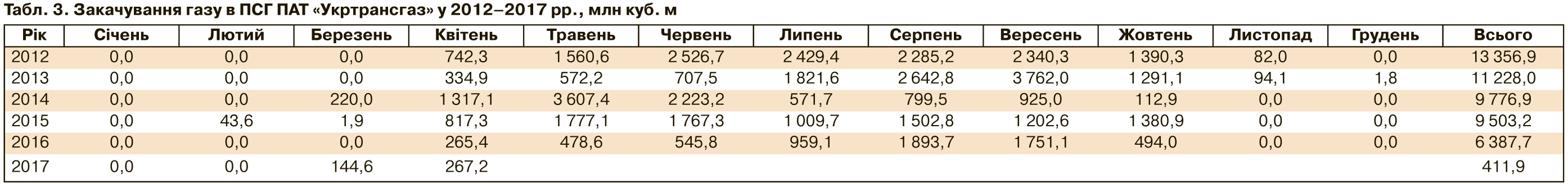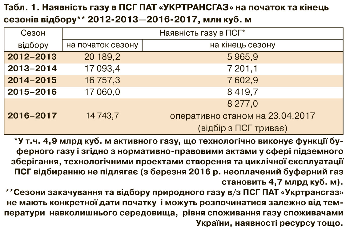 Після закінчення опалювального періоду 2016–2017 рр. у підземні сховища "Укртрансгазу" за першої ж нагоди розпочали закачувати газ. Тимчасове різке похолодання змусило перервати це процес, але вже на 26 квітня у ПСГ було 8,33 млрд кубометрів газу. У табл. 1 показано, скільки газу було у ПСГ на початок і закінчення опалювальних сезонів. Щомісячну динаміку закачування газу в ПСГ "Укртрансгазу" наведено у табл. 3.