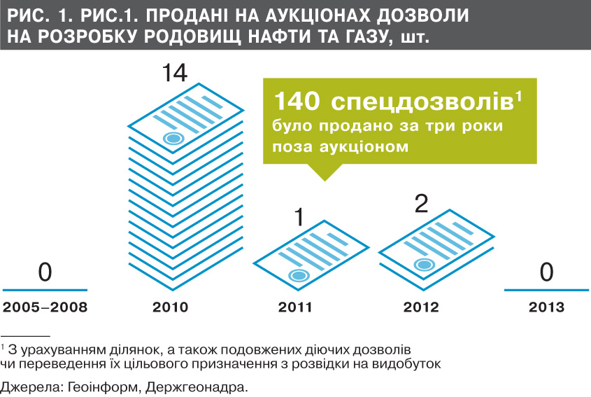 Учасники ринку схвально оцінюють таку довгоочікувану ініціативу держави, однак висловлюють серйозні сумніви щодо ефективності її практичної реалізації. Скептицизм пояснюється багаторічною практикою проведення аукціонів в Україні. Так, протягом 2011–2013 рр. на відкритих торгах було продано лише три спецдозволи на розробку нафти і газу. При цьому за позааукціонною процедурою (використовуючи різні виверти в законодавстві) на користь приватних, і здебільшого маловідомих, компаній було "тишком" продано близько сотні дозволів на нові ділянки (див. рис. 1).