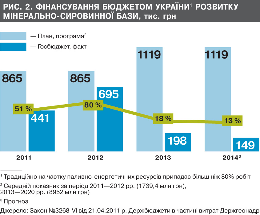 Законодавчою підставою для оплати проведення геологорозвідувальних робіт (ГРР) за держкошти є загальнодержавна програма розвитку мінерально-сировинної бази України на період до 2030 року. Аналіз перших років її впровадження свідчить про критичне недофінансування геофізиків держустанов, які фактично перестали проводити будь-які дослідницькі роботи "у полях". Недостатні обсяги ГРР проводять і комерційні компанії на своїх ліцензійних ділянках. Так, у 2013 році було зафіксоване різке падіння обсягів буріння, насамперед за рахунок скорочення робіт підприємствами НАК "Нафтогаз України" (переважно це підрозділи "Укргазвидобування" та "Укрнафти").