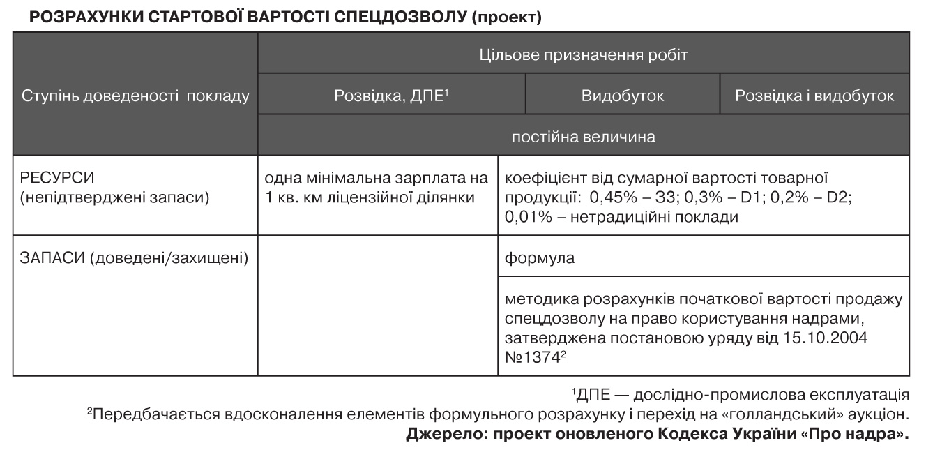 - вартість спецдозволу на діяльність з видобутку або суміщені розвідку й видобуток для ділянок з незатвердженими ресурсами фіксується до сумарної вартості потенційної товарної продукції при коефіцієнті переведення ресурсів у запаси - 0,45% для категорії С3, 0,3% - D1, 0,2% - D2, 0,01% – на розробку нафти і газу з нетрадиційних колекторів;
