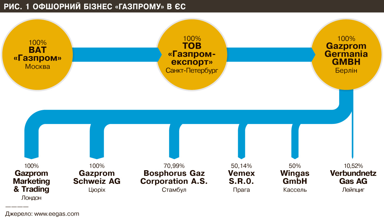 Продаж природного газу в Німеччину здійснює компанія "Газпромекспорт", яка є 100-відсотковим дочірнім підприємством ВАТ "Газпром". "Газпромекспорт" не лише продає газ німецьким компаніям-партнерам, а й має бізнес із компанією Gazprom Germania GMBH, що на 100% належить їй же. У свою чергу, Gazprom Germania є власником пакетів акцій, що належать їй у різних підприємствах, зареєстрованих у різних країнах Європи (див. рис.1).
