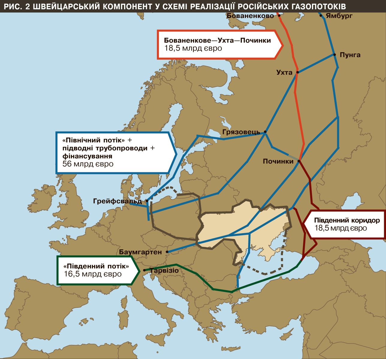 Для того, щоб зазначена сума розтеклася ріками та струмками і потрапила на потрібні рахунки потрібних людей у різних країнах, і необхідний швейцарський компонент у схемі реалізації "Південного потоку" (див. рис. 2).