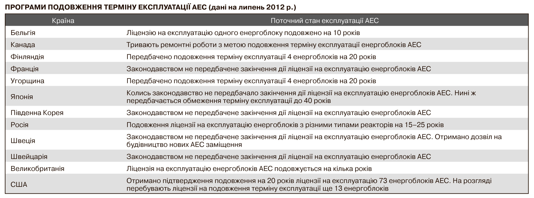 У світі подовження терміну експлуатації енергоблоків - уже усталена практика. Станом на липень 2012 р., аналогічні рішення приймали Франція, Фінляндія, Угорщина, Японія, Росія та США. А в деяких країнах узагалі на законодавчому рівні не передбачене закінчення дії ліцензії на експлуатацію АЕС (див. табл.). Економічний аналіз, проведений Агентством із атомної енергетики при ОЕСР, показав, що майже в усіх випадках подовження терміну експлуатації АЕС хоча б на десять років є економічно вигідним.
