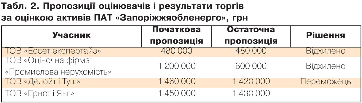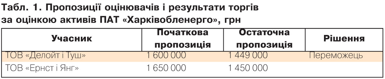 У тендері на оцінку активів "Харківобленерго" взяли участь тільки дві компанії - ТОВ "Делойт і Туш" і ТОВ "Ернст і Янг". При очікуваній ціні замовлення в 2 млн грн оцінці підлягало близько 99 тис. позицій. Простіше кажучи, замовник був готовий заплатити 20 грн за одну позицію. Остаточна ціна, запропонована ТОВ "Делойт і Туш", становила 1,449 млн грн. При цьому стартова ціна відрізнялася на